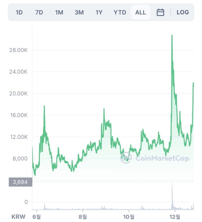 (왼쪽) 전체 차트 중앙) 21년 1 0월~12월 차트 우측) 21년 12월 차트 날개코인은 코인마켓캡 기준으로 21년 5월부터 시세 확인이 가능합니다. 그 시점은 4천원대였는데, 급락/급등을 반복해서 12월 초에 1만원대에서 3만원대로 급등했다가 다시 1만원대로 폭락했고, 다시 12월 하반기에 급등했어요.